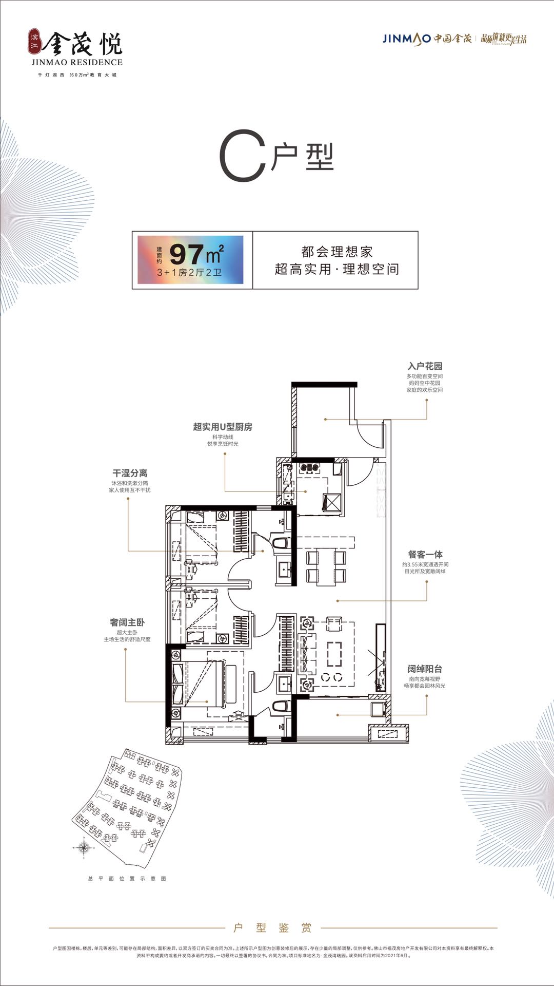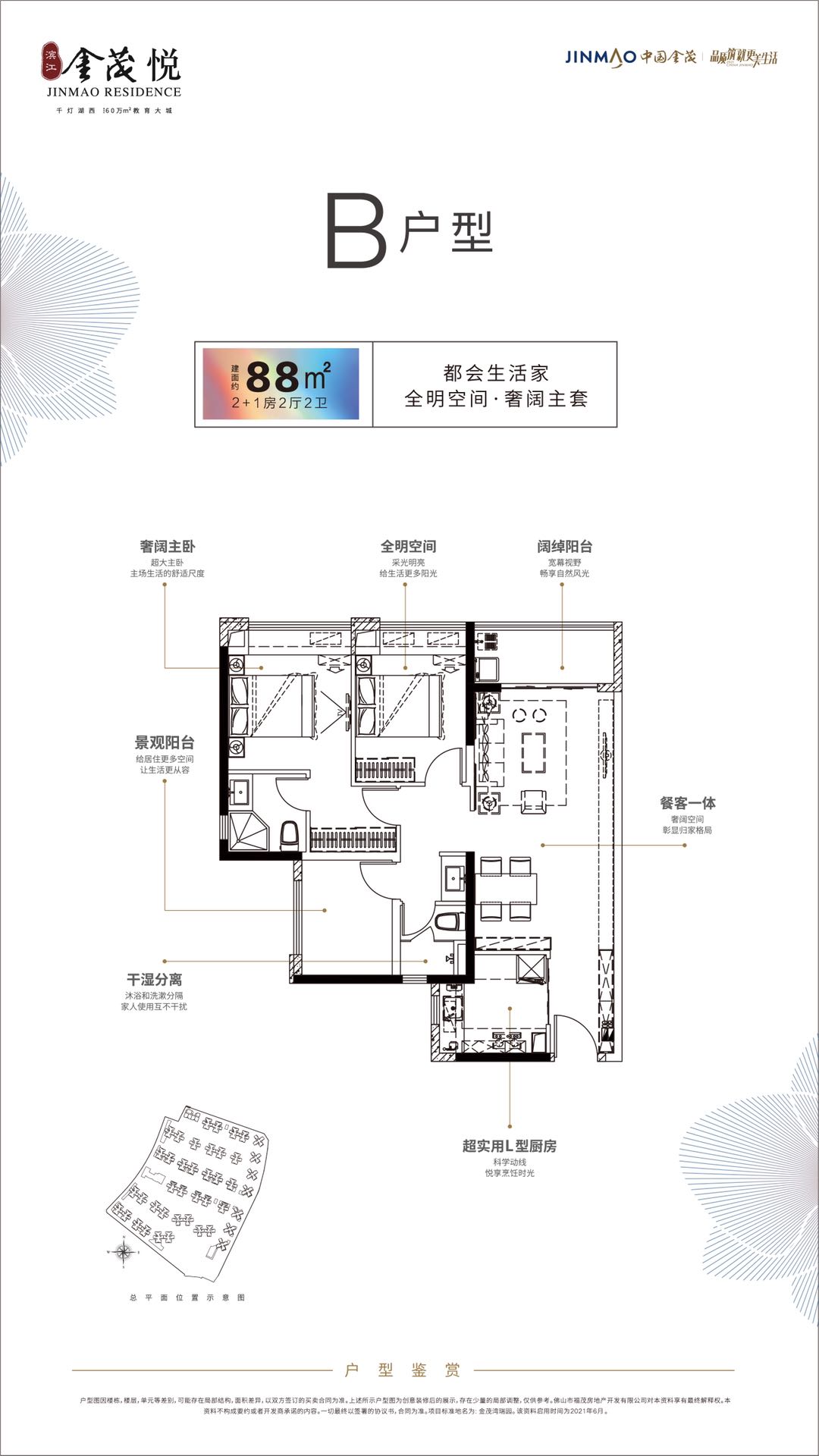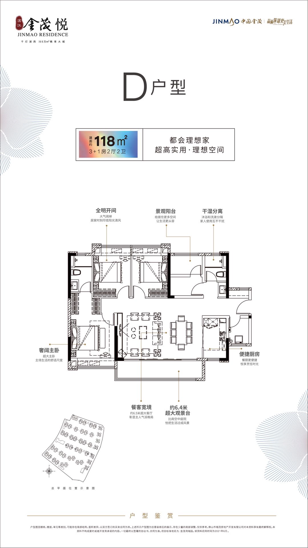 滨江金茂悦位于千灯湖西、佛山西站高铁枢纽圈,是由央企金茂打造的建面约60万m2的滨江教育超级大城。临近佛山西站超级交通枢纽+4条地铁+2条城轨。东接桂丹璐, 20分钟可到千灯湖、40分钟到荔湾;南连“沙口大桥”,20分钟直达禅城祖庙。 滨江金茂悦环绕“一江双园”,“一江”为东南一线望汾江河,“双园”有3KM滨江公园将串联汾江河景观带,南侧将建设1.7万m2金小象公园。项目北侧规划建设9年一贯制的公立学校,自身配备了两所12班和15班的幼儿园,让孩子轻松走路上学。项目自身配套1万m2亲水商业街区,300米内有美盛广场和兴塱美食广场,周边有金盛广场和富弘广场。园林配备泳池、架空层休闲亲子空间等构建全龄社区,实现“一生之城”的都市理想生活。