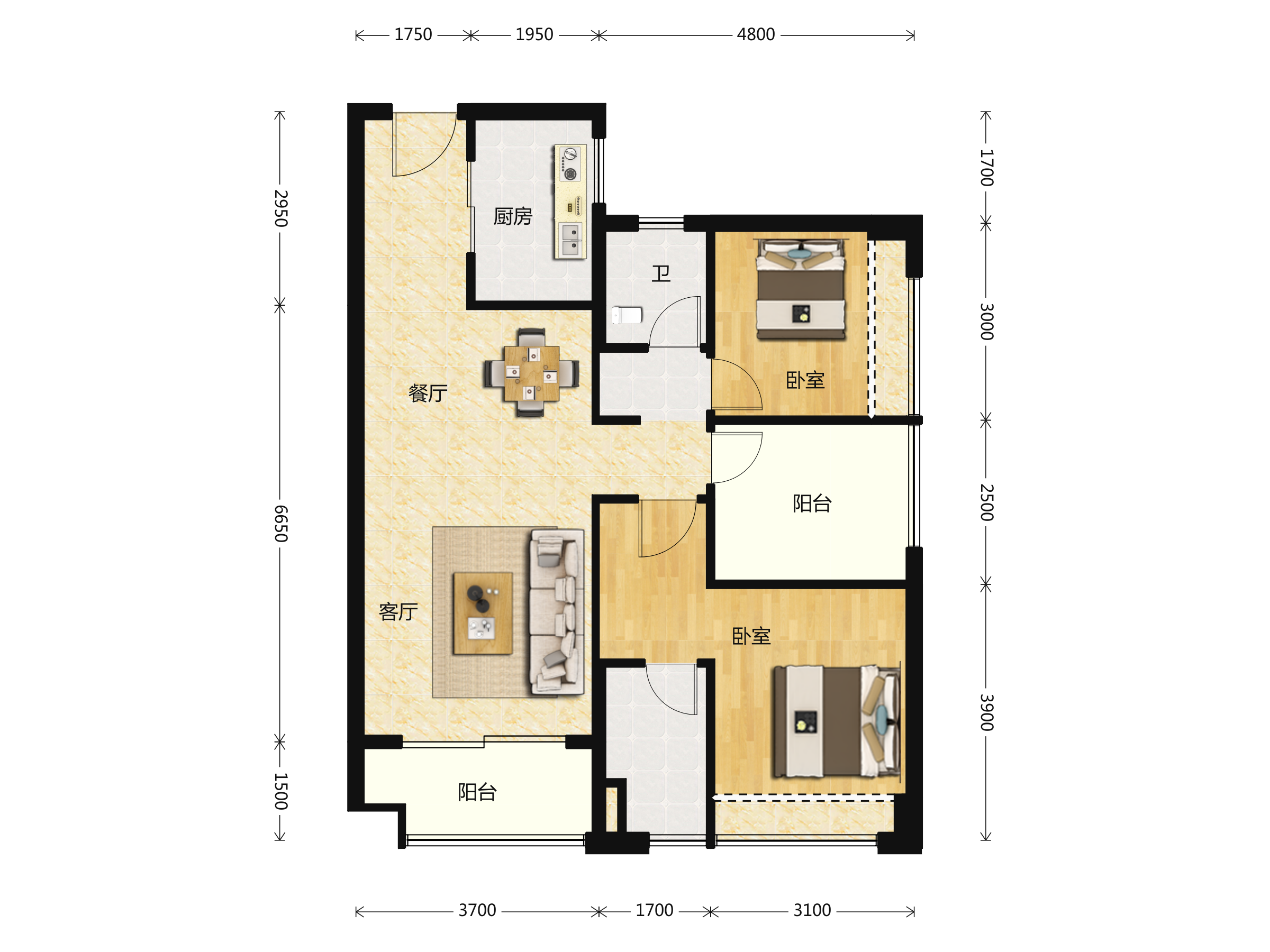 • 户型名称:96㎡2房1厅1卫