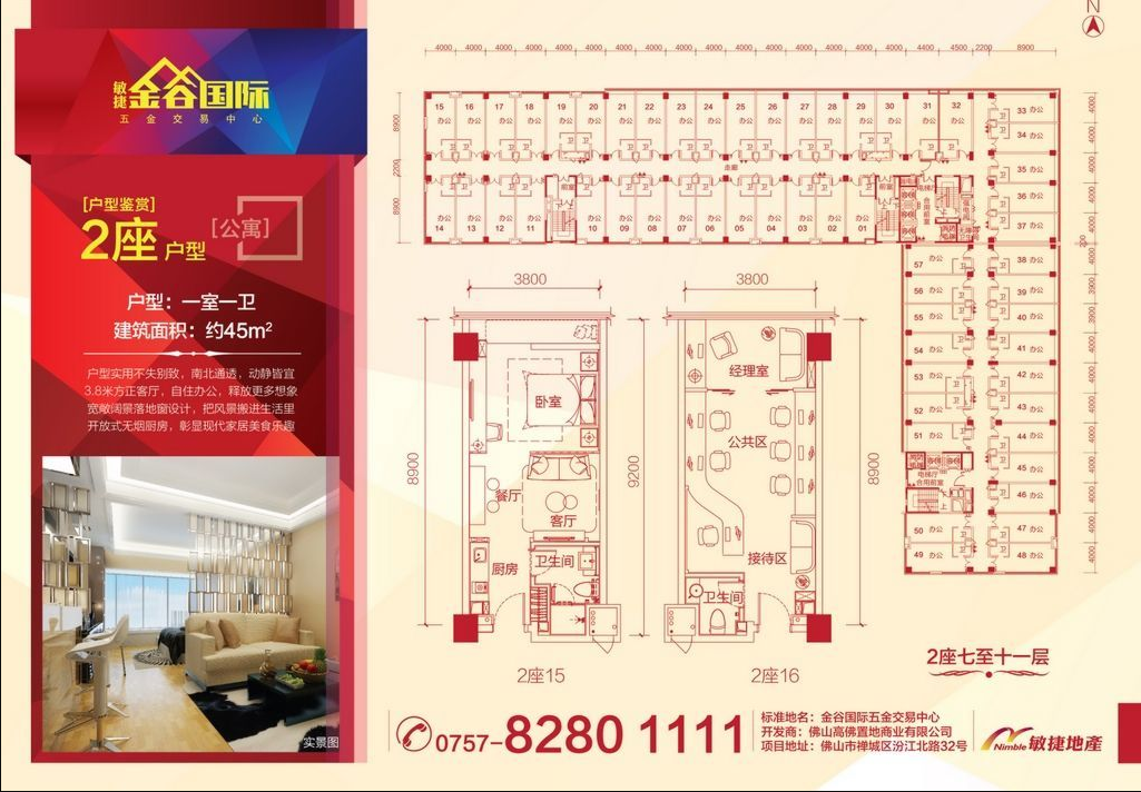 敏捷·金谷国际位于佛山市禅城汾江北路与海五路交界处,项目致力于打造城市产城一体化,总建规模达43.8万㎡,集专业市场、写字楼、SOHO(家庭办公)、住宅等多样、复合功能产品于一体的商住综合体项目。 项目紧邻千亿配套广东省金融高新区千灯湖和古今政治经济文化中心祖庙商圈,佛山城市北向发展要地,承接传统五金交易产业深基,效率化土地、产业及产业配套服务,是集生态、产业、居住、休闲等功能于一体的24小时活力新城。敏捷·金谷国际现楼公寓,户型设计合理,独立厨、卫设计,功能齐全。小空间、大作为,投资、自主皆可。独立产权式商铺现全球招商运营中,多元化规划配套。