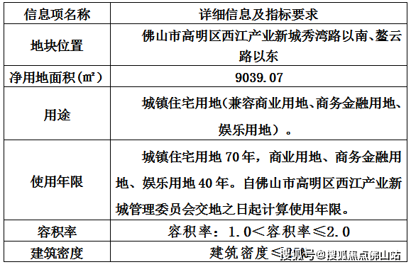 宗地具体位于佛山市高明区西江产业新城秀湾路以南、鳌云路以东,容积率:1.0<容积率≤2.0,建筑密度≤25%,绿地率≥30%,建筑限高≤60米。