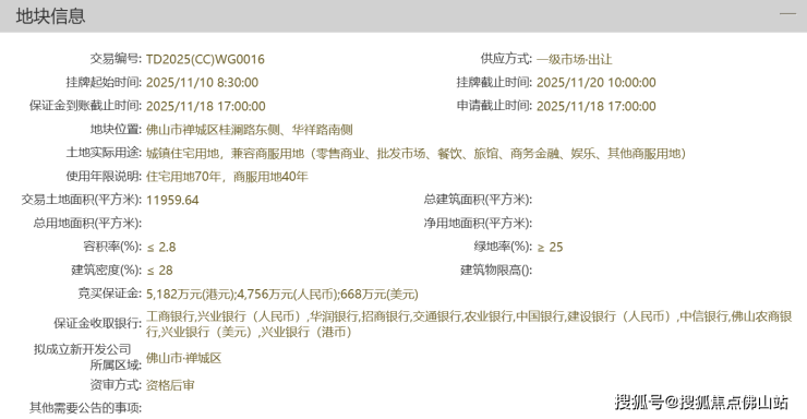 10月22日,禅城区桂澜路东侧、华祥路南侧地块挂牌出让,起拍总价23776万元,折合楼面价约7100元/㎡,将于11月20日上午10时开拍。