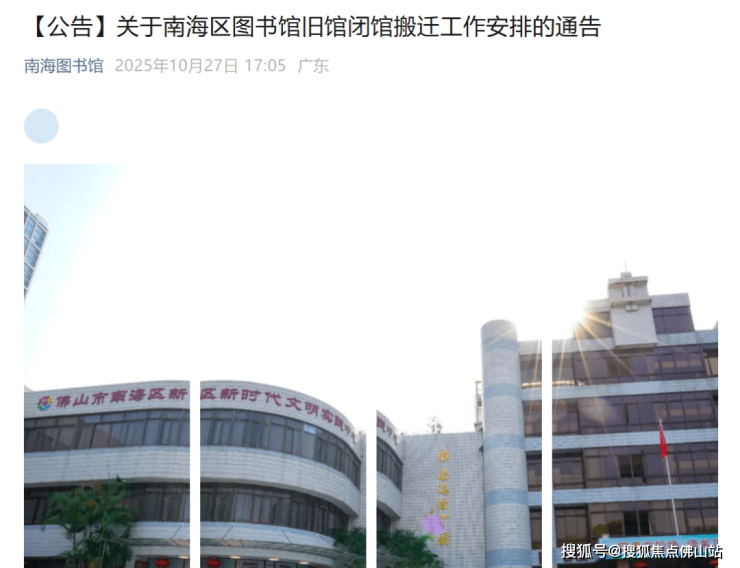 南海区图书馆发布的闭馆通知显示,从2025年11月12日起,南海区图书馆现有场馆将关闭对外服务,新馆将搬至南海文化中心,预计2026年春天开放。