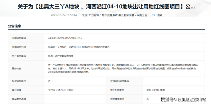 近日,广东省中介超市交易系统发布关于为【出具大三丫A地块 、河西沿江04-10地块出让用地红线图项目】公开选取【测绘】机构的公告。