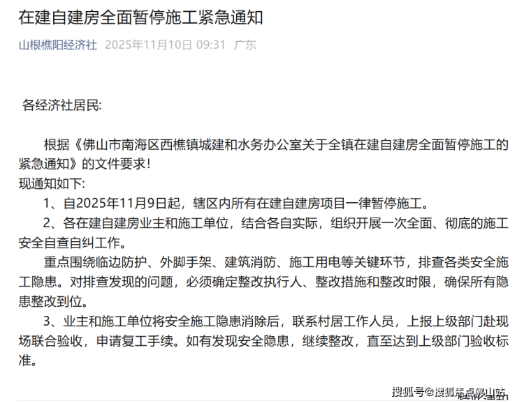 通知显示,根据《佛山市南海区西樵镇城建和水务办公室关于全镇在建自建房全面暂停施工的紧急通知》的文件要求!