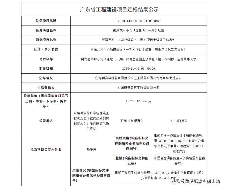 11月12日,广东省公共资源交易平台发布南海艺术中心场馆建设(一期)项目土建施工总包定标结果公示。
