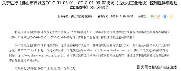 公告显示,按照《佛山市控制性详细规划管理工作规程(2023年修订)》,佛山市自然资源局禅城分局联合张槎街道办事处组织编制了《佛山市禅城区CC-C-01-03-01、CC-C-01-03-02街坊(古灶村工业地块)控制性详细规划局部调整》。