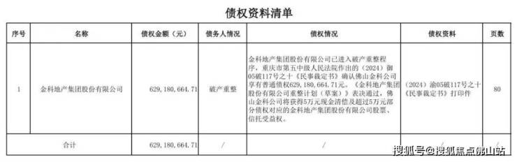 债权资料清单显示,金科地产集团股份有限公司已进入破产重整程序,重庆市第五中级人民法院作出的(2024)御05破117号之十《民事裁定书》确认佛山金科公司享有普通债权629,180,664.71元。