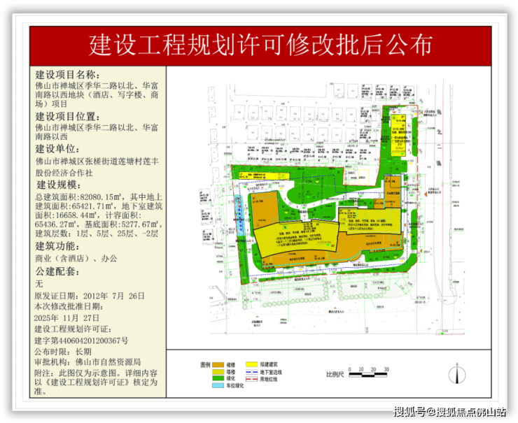 近日,佛山市自然资源局禅城分局对佛山市禅城区季华二路以北、华富南路以西地块(酒店、写字楼、商场)项目建设工程规划许可修改批后公布。