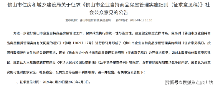 1月19日,佛山市住房和城乡建设局发布关于征求《佛山市企业自持商品房屋管理实施细则(征求意见稿)》社会公众意见的公告。