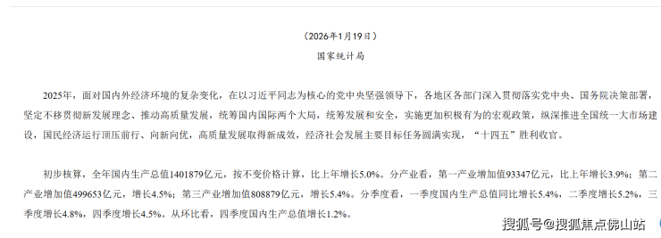 1月19日,国家统计局发布数据显示,初步核算,2025年全年国内生产总值1401879亿元,按不变价格计算,比上年增长5.0%。
