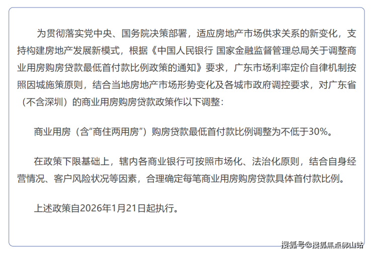 1月21日,中国人民银行广东省分行发布广东省内20个城市调整商业用房购房贷款最低首付款比例政策。