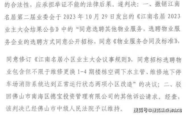 从案件的最终审理结果来看,法院判决撤销江南名居业委会于2023年10月发出的“江南名居2023业主大会结果公告”中5项决议,包括“同意选聘其他物业服务”。