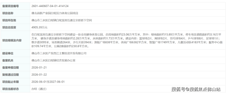近日,佛北战新产业园白坭活力体育公园项目已通过备案。