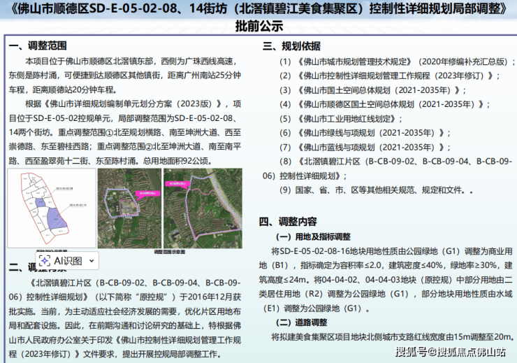日前,佛山市自然资源局顺德分局发布关于《佛山市顺德区SD-E-05-02-08、14街坊(北滘镇碧江美食集聚区)控制性详细规划局部调整》的批前公示。