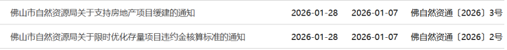 1月28日,佛山市自然资源局发布了《关于限时优化存量项目违约金核算标准的通知》和《关于支持房地产项目缓建的通知》两则通知。