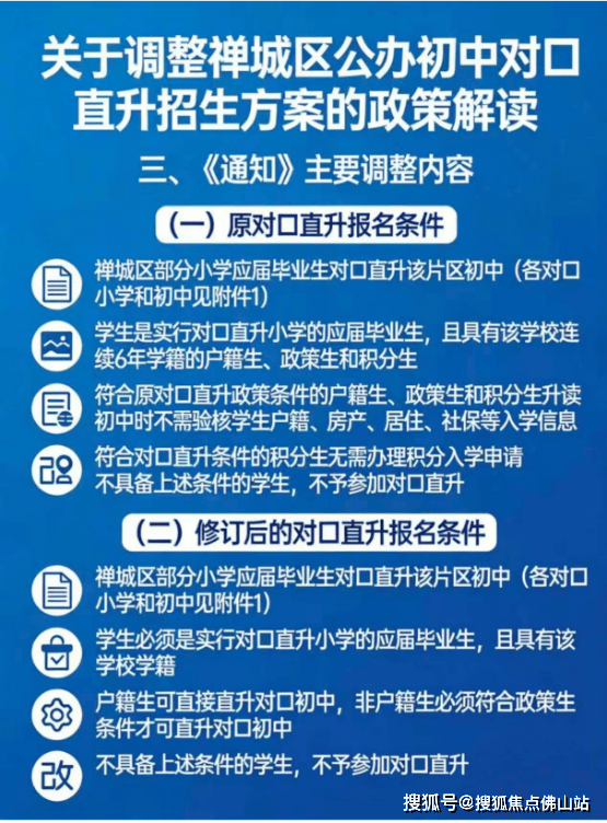 根据最新发布的《佛山市禅城区教育局关于调整禅城区公办初中对口直升招生方案的通知》,为加大力度保障禅城区户籍人口及非户籍适龄少年的学位需求,新政策规定,禅城区部分公办小学的应届毕业生通过对口直升方式入读对应片区初中,学生必须是对口直升小学的应届毕业生,且拥有该校学籍,户籍生可直升对口初中,而非户籍生则必须符合政策生条件才能直升对口初中,不具备上述条件的学生,不予参加对口直升。其中,常见的政策生条件要求新生的家长一方在禅城区连续缴纳社会保险满5年、持有禅城区有效居住证满5年。