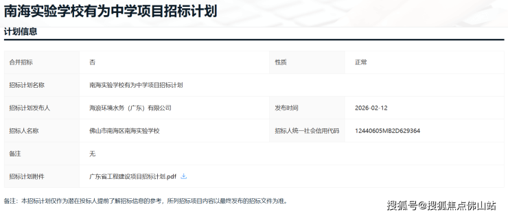 日前,南海实验学校有为中学项目招标计划正式发布。