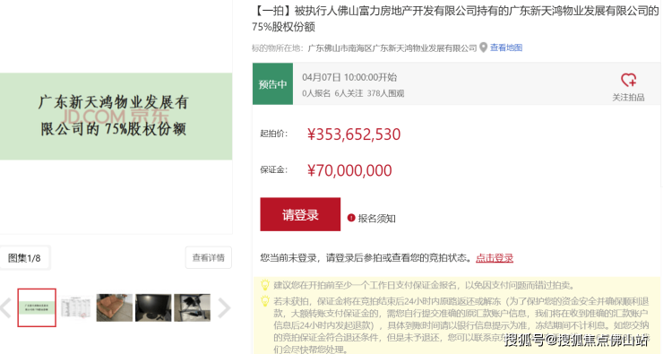 近日,京东拍卖平台显示,被执行人佛山富力房地产开发有限公司持有的广东新天鸿物业发展有限公司的75%股权份额将于4月7日开拍,起拍价约3.53亿元。