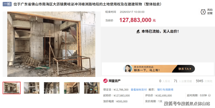 近日,位于广东省佛山市南海区大沥镇黄岐泌冲浔峰洲路地段的土地使用权及在建建筑物最终流拍,起拍价为127,883,000元。