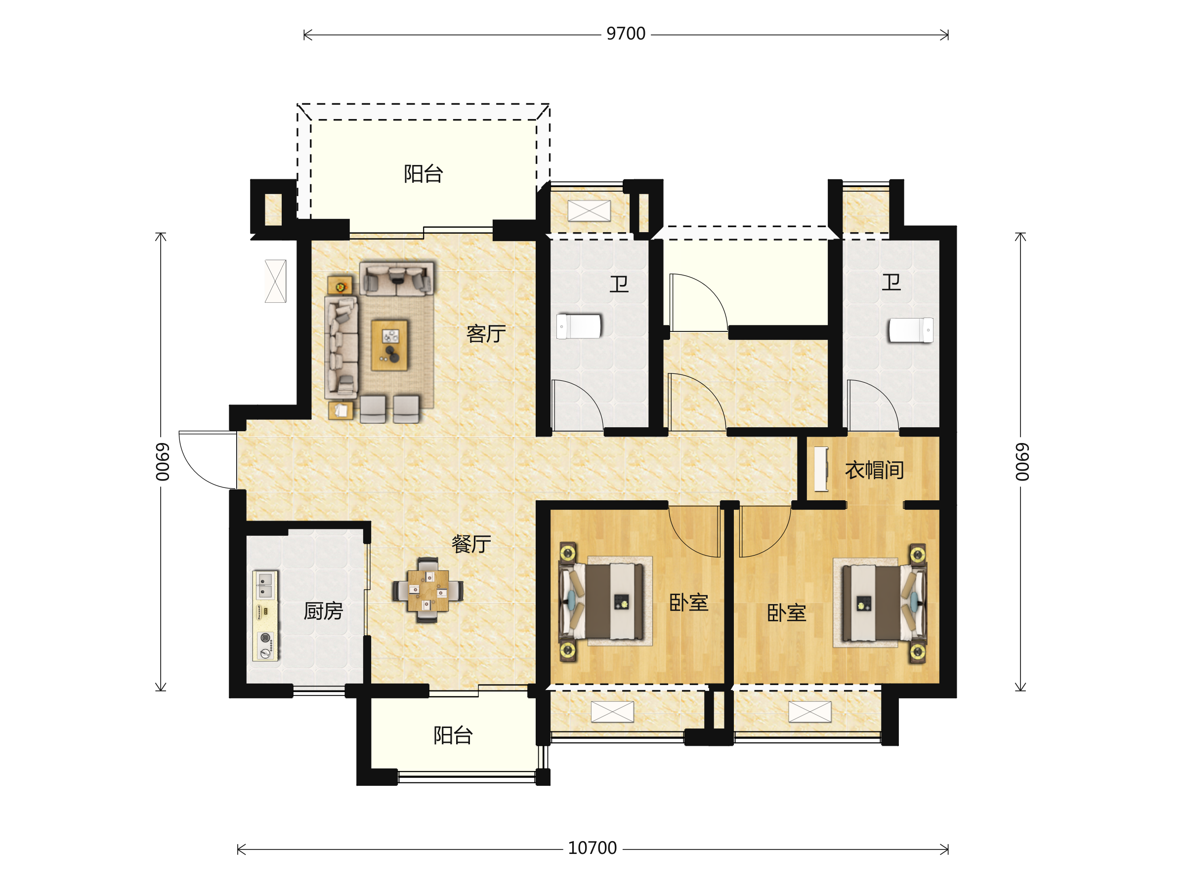 • 户型名称:3室2厅2卫,96平米户型