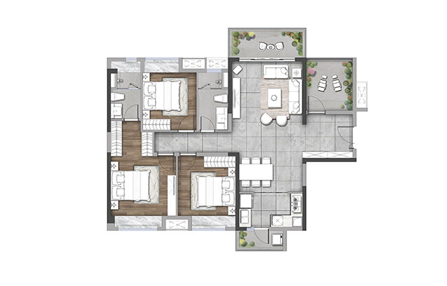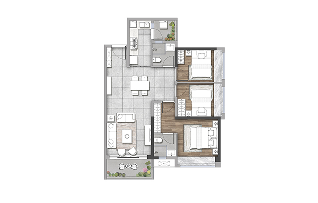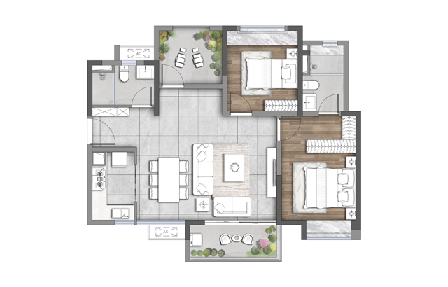 ·整体布局舒朗,动静分区不干扰,大方通透 ·客餐厅纵贯一线,开阔敞亮,尽享惬意时光 ·阔气主卧与多功能阳台相通,私享雅致宽景 ·零过道优化设计,创造更多的闲适生活空间